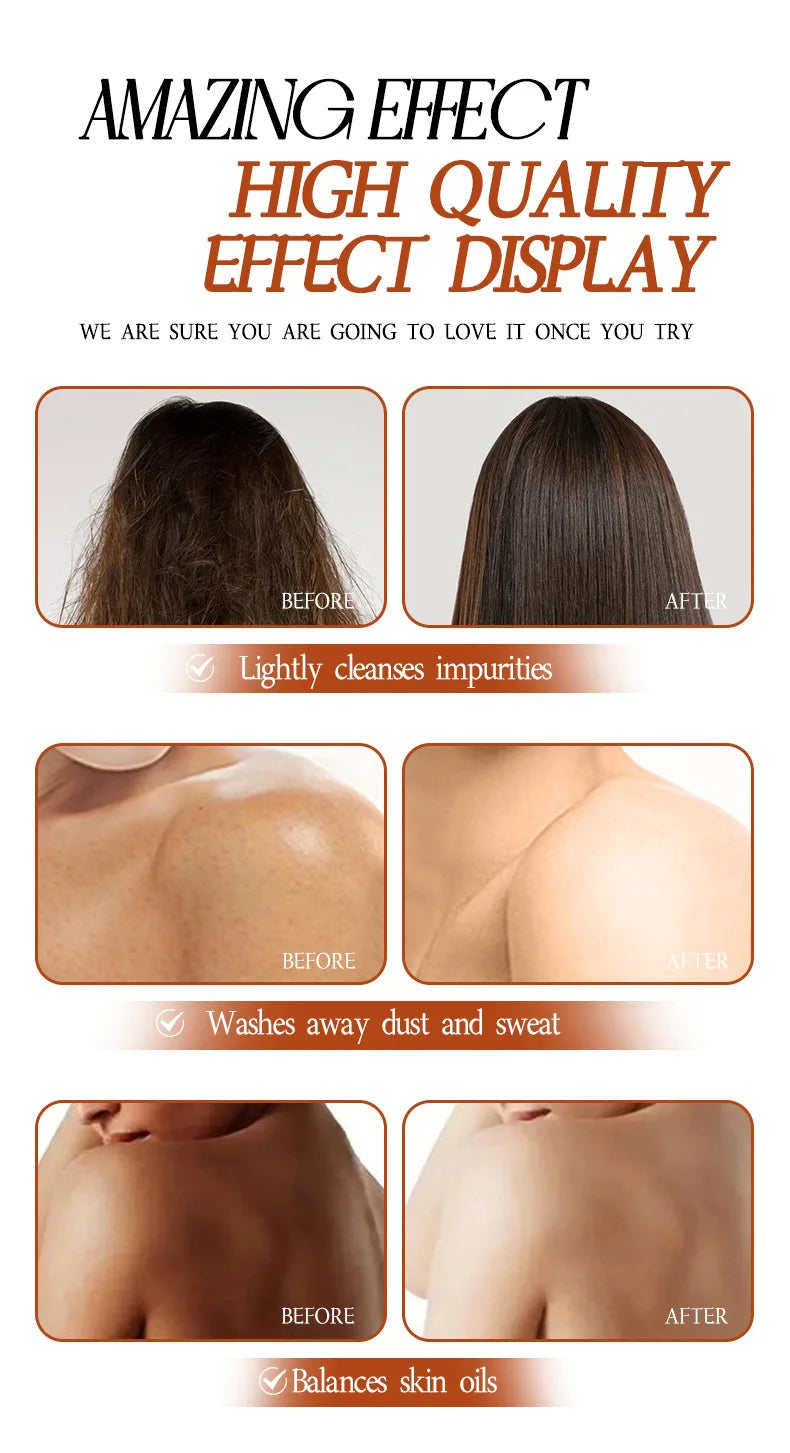 • Fonctionnalités : Il sert à la fois de shampoing et de savon pour le corps, simplifiant ainsi votre routine de nettoyage.